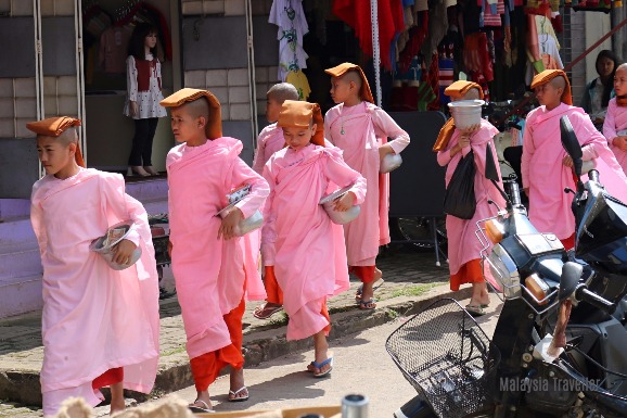 'Monklets'Bands of pink-robed novice nuns make regular alms collections around town. At the general market I noticed stall holders were dropping items such as 3-in-1 coffee sachets, pieces of fruit, and low denomination banknotes into their begging bowls. They are photogenic but do not seem to like being photographed.