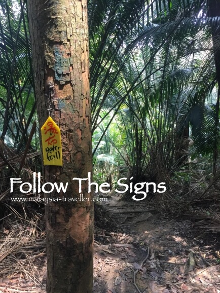 The trail down to Apeh waterfall is currently well signposted with these yellow markers.