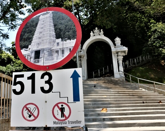 To reach there devotees and tourists have to scale 513 steps. A separate flight of steps is provided for people descending from the temple so that there is a one-way system to ease congestion during peak periods such as Thaipusam Festival when as many as 700,000 devotees might be expected.