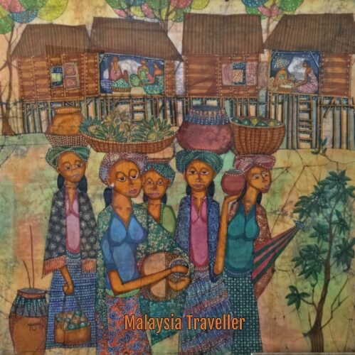 'Women with Baskets' batik on cloth painted in 1991 by Yong Kheng Wah (born 1945). Kampung houses on stilts in the background.