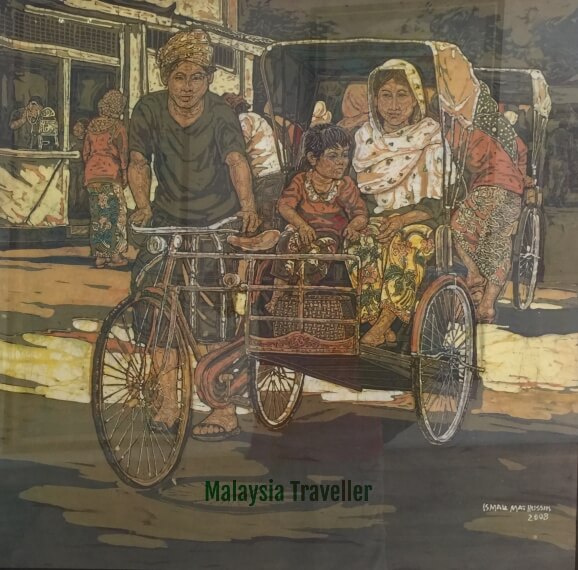 'Two Trishaws' batik painted on cloth in 2008 by Ismail Mat Hussin (1938-2015). Trishaws are becoming rarer in Malaysia (except for tourist rides) but are still used for transport in parts of Kelantan.
