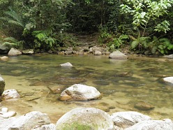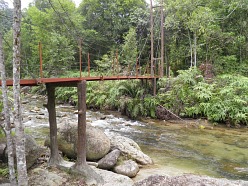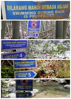 After a short walk you reach the rangers' office where you need to register and pay the entrance fee of RM1 per person. A notice there warns visitors that they must also sign out in the register on their return which should be before 5.30pm. If it starts raining during your visit you must return immediately as the river and waterfalls are dangerous in rainy weather. There are toilets and a campsite here and a map giving an idea of what is in store. Warning: the map is not to scale and is misleading. |