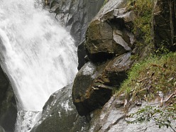 There are two more waterfalls here. If, instead of taking Crossing 6, you stay on the same side of the river you will soon arrive at a steep slope with a path covered in tree roots. If you scramble up this slope you can reach the upper falls. This is the middle level fall which is inaccessible. |