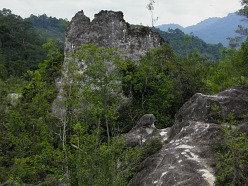 If by mistake you go straight at the 'crossroads' instead of turning left, the path takes you uphill and away from the river. After 15 minutes or so sweaty climbing you emerge at a clearing with a good view of some jagged hills. Quite interesting but this is the wrong way. Turn back! |