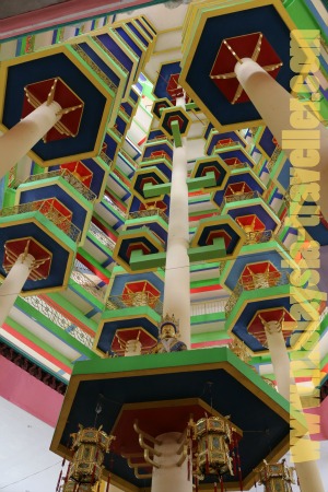 Colourful atrium of the pagoda.The pagoda’s interior has a hollow atrium. The appearance of the temple is certainly striking though the gaudy colours and kitsch decor may not be to everybody’s taste. The quality of construction materials used and the workmanship is not all that it could be but the place is fascinating all the same. It’s a shame it is not busier. One time when it does get busy is Wesak Day. On this year’s Wesak Day, 3rd May 2015, thousands of devotees descended on the temple to pray for wisdom and good fortune. They unfurled a 60 m by 12 m ‘thangka’ which is a giant scroll illustrated with Buddhist images.