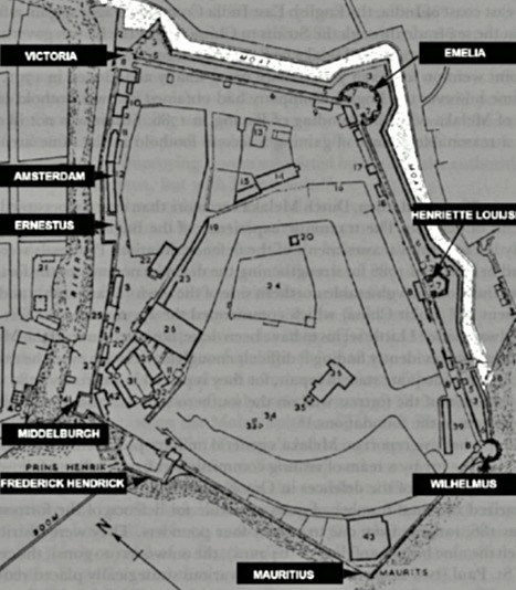 This photo shows where the walls stood superimposed on an aerial shot of modern Melaka.And here is a map of the locations of the bastions mentioned above: