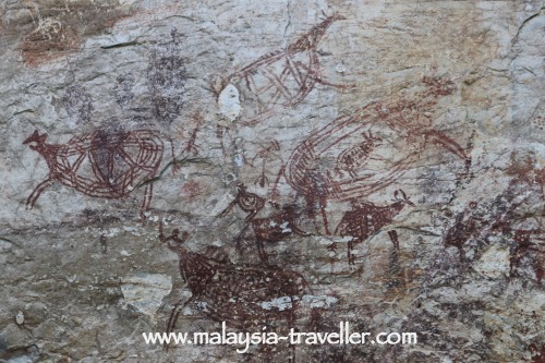 They have been painted on the side of a limestone cliff ~ they are not really in a cave at all but on a rock shelter, a slightly overhanging ledge, located between 5 and 25 metres above the ground level. They were most likely painted using haematite.