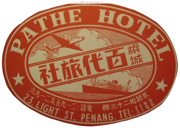 Pathe Hotel, 23 Light Street, Penang. This hotel, and the building in which it operated, no longer appear to exist. It was probably not in the luxury category but its label is typical of the mid 20th century.