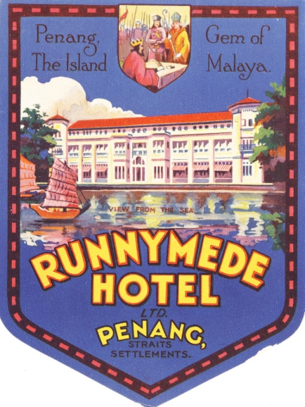The Runnymede Hotel building shown in this label was built in the 1930s and was one of Penang's leading hotels. The building still stands but has been empty and decaying for many years. In 2018 plans were announced to build a new luxury hotel on the site while still preserving the original heritage building. The label shows a picture of King John signing the Magna Carta at the original Runnymede in Surrey, England.