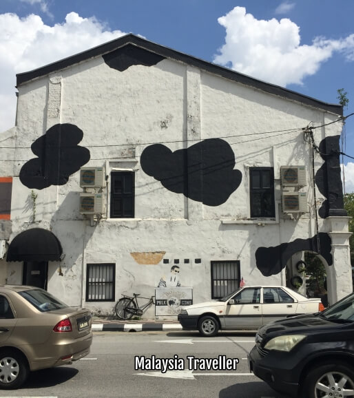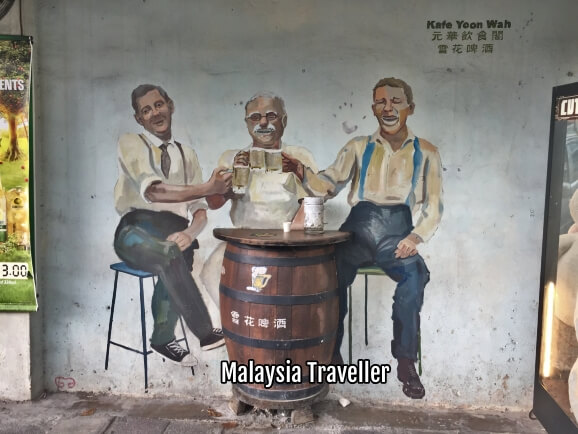 Mr Bean-like man and friends promoting a café.If it's raining you can still see murals indoors at Wisma Chye Hin on Jalan Sultan Idris, Ipoh.