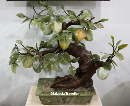 There are a number of museum quality pieces on display including a pair of green jade chairs, or Twin Dragon Thrones, of the sort reserved for the Emperor and Empress. There are some fine jade Buddha and Guan Yin statues, some beautiful vases, a jade cabbage, a star fruit bonsai tree made from jade and many other attractive artworks.