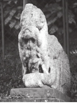 From this photo of the Makara while it was still outdoors on the wall you can make out the figure of a man standing with one leg raised in the open mouth of the creature.
