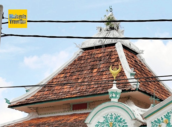 The traditional Malay style plaster roof crown has a floral design, topped with a small Islamic moon and star symbol. The lime mortar roof ridges add strength to the roof and help prevent leaks. Their decorative design borrows from traditional Chinese construction methods.