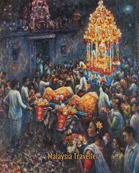 Silver Chariot Procession, oil on canvas by Yuen Chee LingEleven well known local artists are represented in this collection which, according to the publishers, captures 'the quintessence of Penang with scenic landscape, heritage buildings, ethnic cultures, rural villages, flora and birds.